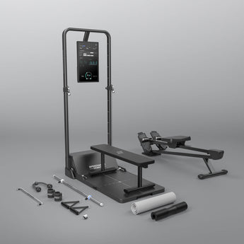 The AeroRow, AeroRow 2, flat bench, adjustable bench,Bluetooth ring,barbell hooks,barbell pad, adjustable barbell,rowing bar, ankle straps,tricep rope, handles,skiing handles,smart handles,yoga mat,weightlifting belt,extender belt,accessory rack,ball connector,resistance cable set.